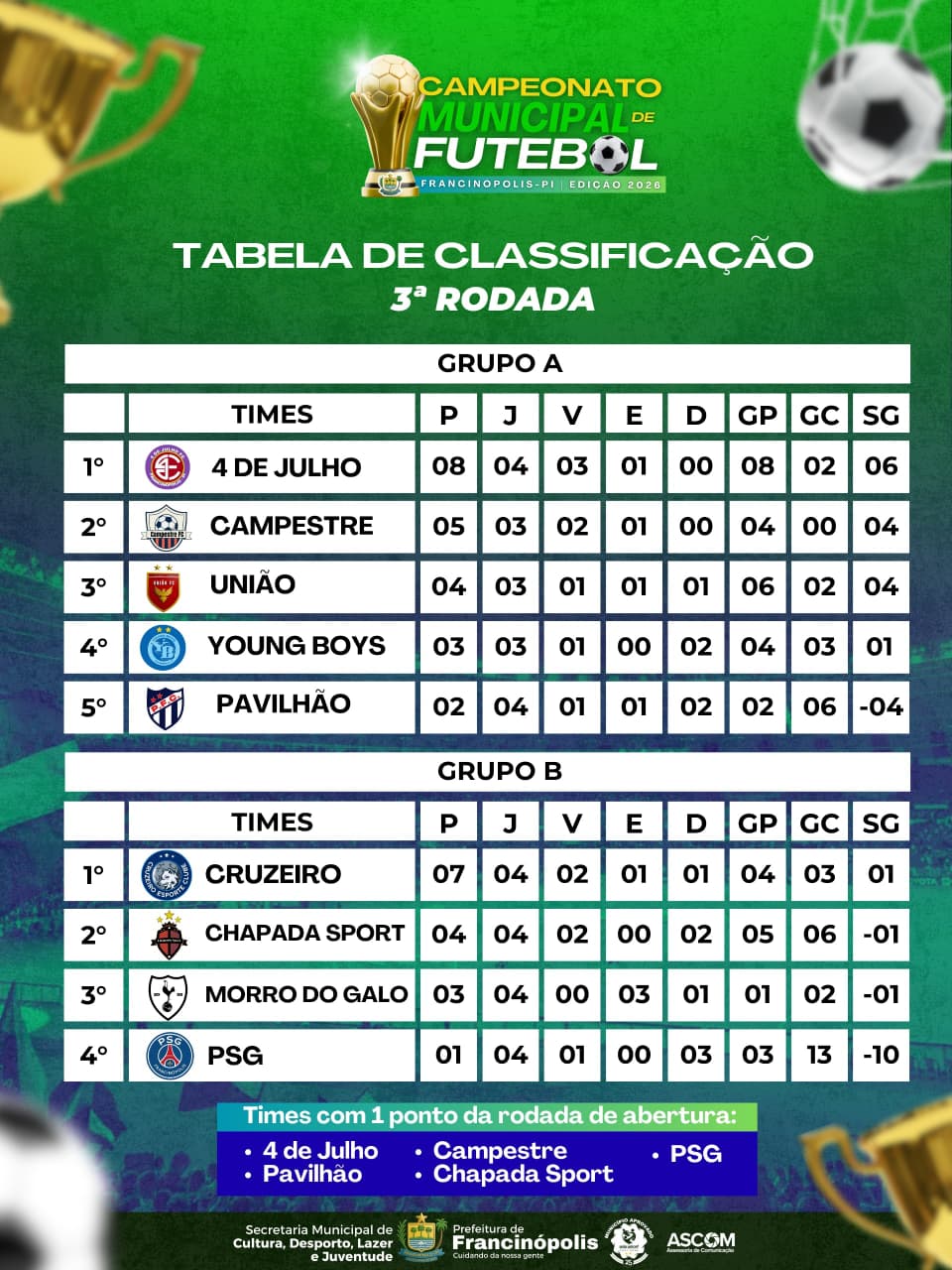 Campeonato Municipal de Futebol 2026: classificação é atualizada após a 3ª rodada -