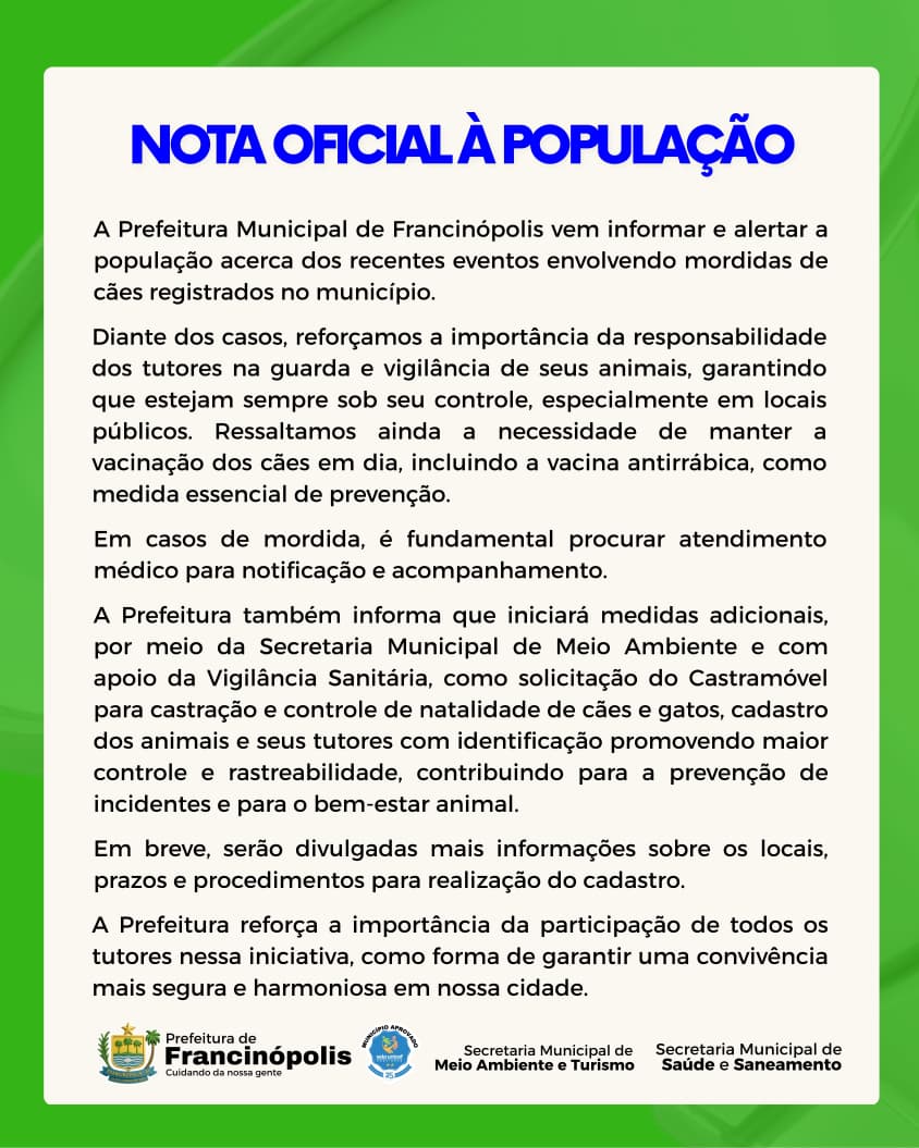 Prefeitura de Francinópolis emite nota oficial e reforça medidas de prevenção após casos de mordidas de cães -