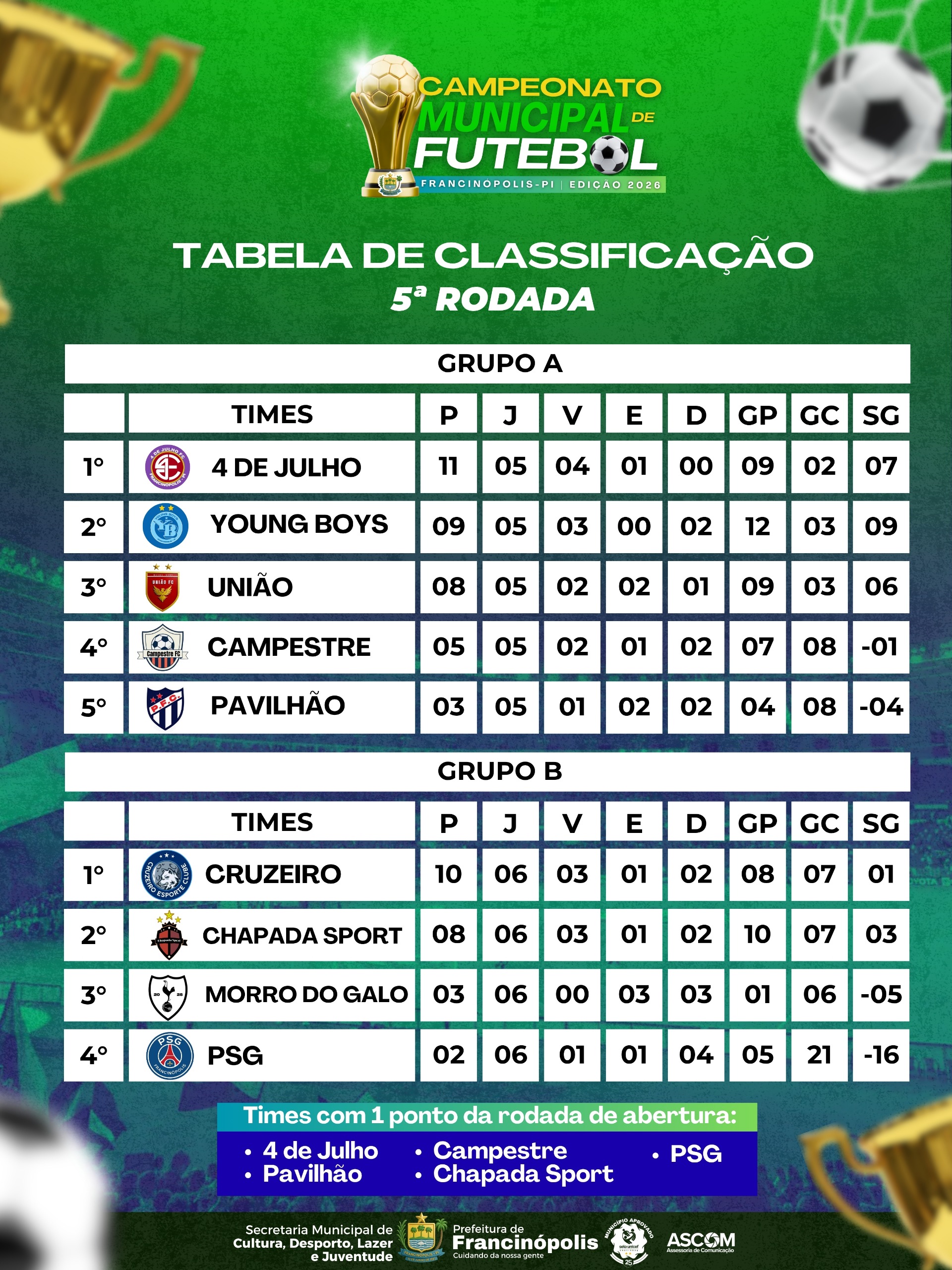 Campeonato Municipal de Futebol 2026: classificação é atualizada após a 5ª rodada -