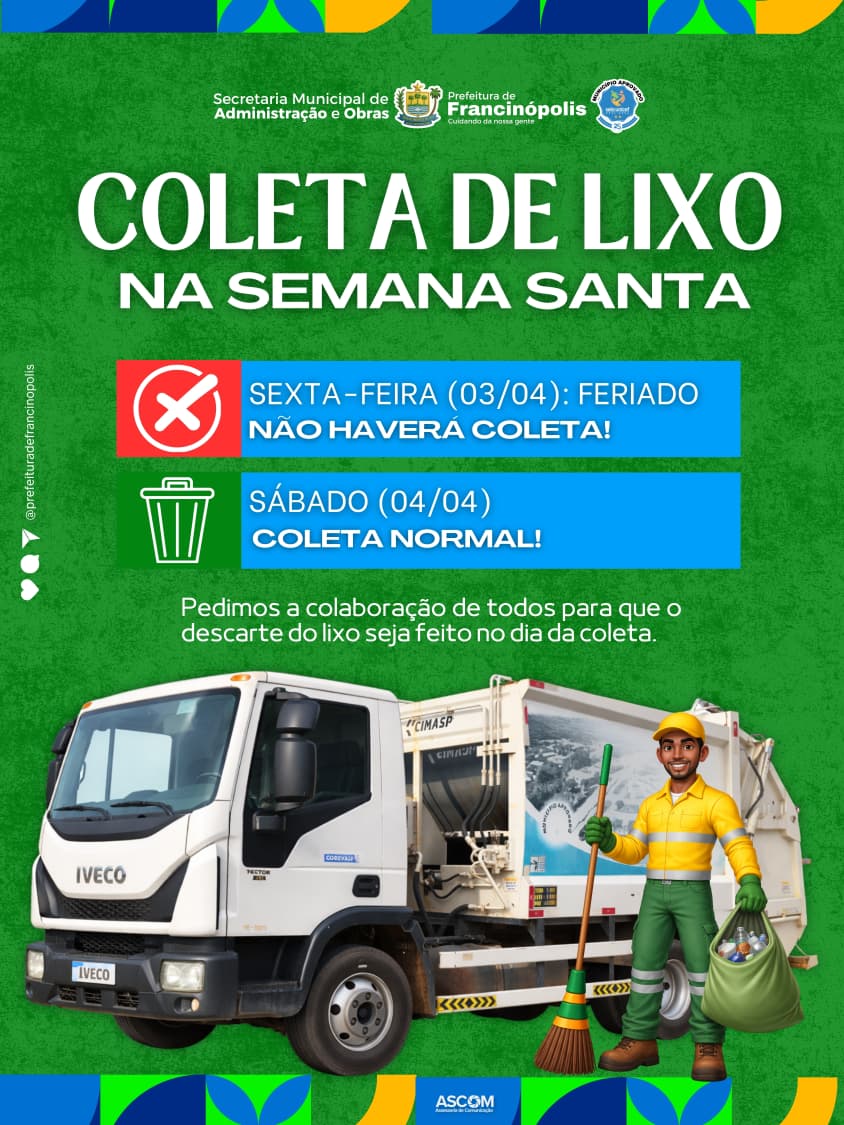 Prefeitura de Francinópolis divulga cronograma da coleta de lixo durante a Semana Santa -