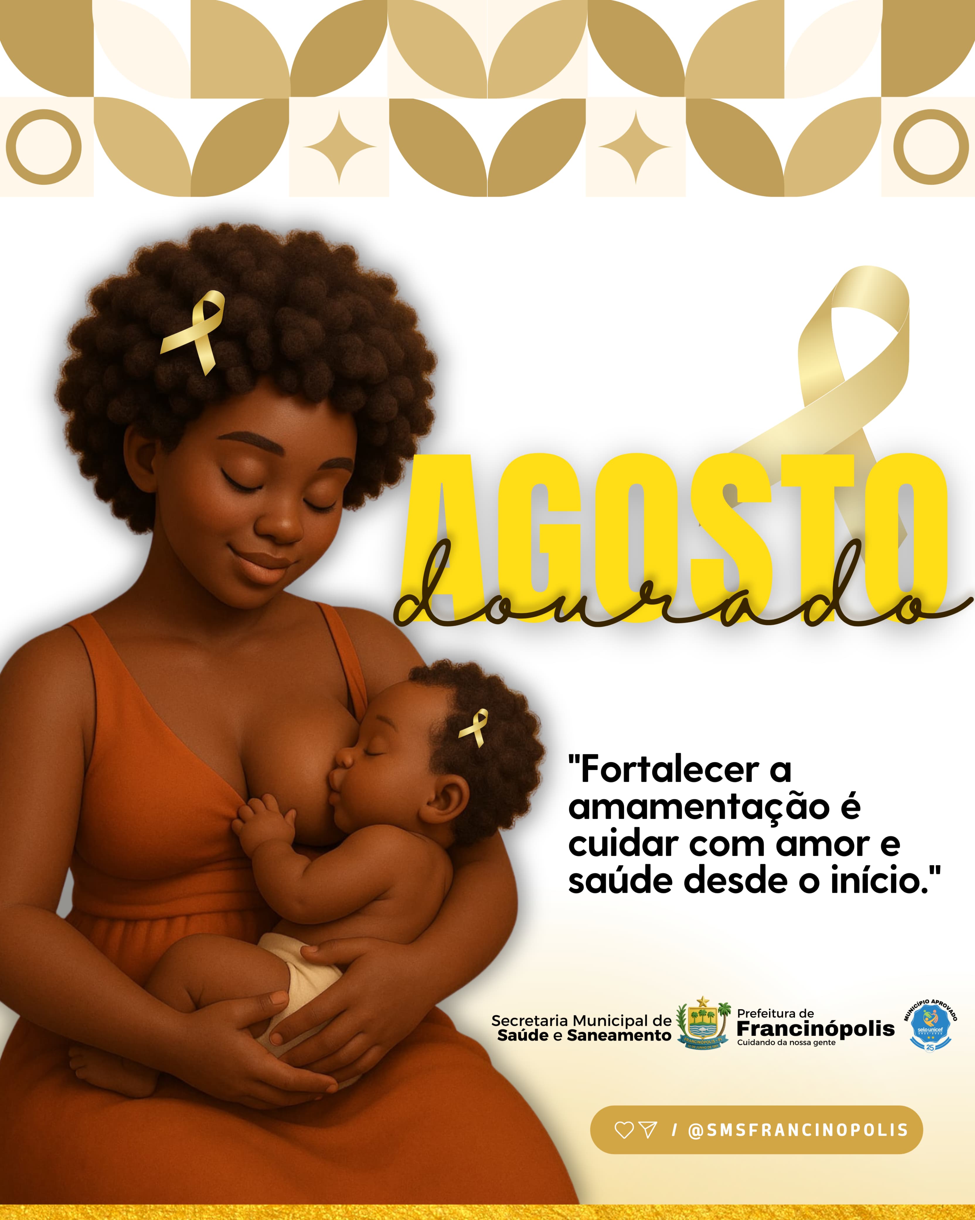 A campanha Agosto Dourado é um movimento que simboliza a luta pela conscientização e incentivo ao aleitamento materno. A cor dourada foi escolhida para representar o "padrão ouro" de qualidade do leite materno, essencial para o crescimento e desenvolvimento saudável dos bebês. Com a frase "Fortalecer a amamentação é cuidar com amor e saúde desde o início", a arte divulgada visa reforçar que o leite materno é o alimento mais completo para os recém-nascidos, oferecendo todos os nutrientes necessários e fortalecendo o vínculo afetivo entre mãe e filho. A Prefeitura de Francinópolis reafirma seu compromisso com a saúde materno-infantil e convida toda a população a apoiar e disseminar a importância do aleitamento materno. Agosto Dourado: amamentar é um ato de amor, proteção e vida!