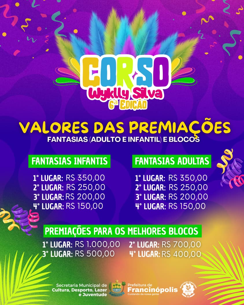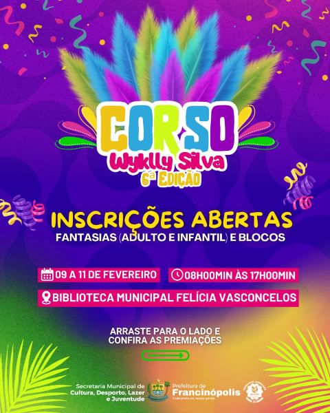 A Prefeitura de Francinópolis, por meio da Secretaria Municipal de Cultura, Desporto, Lazer e Juventude, realizará no sábado, 14 de fevereiro, a 6ª edição do Corso Wyklly Silva, um dos eventos mais tradicionais e aguardados do calendário cultural do município.