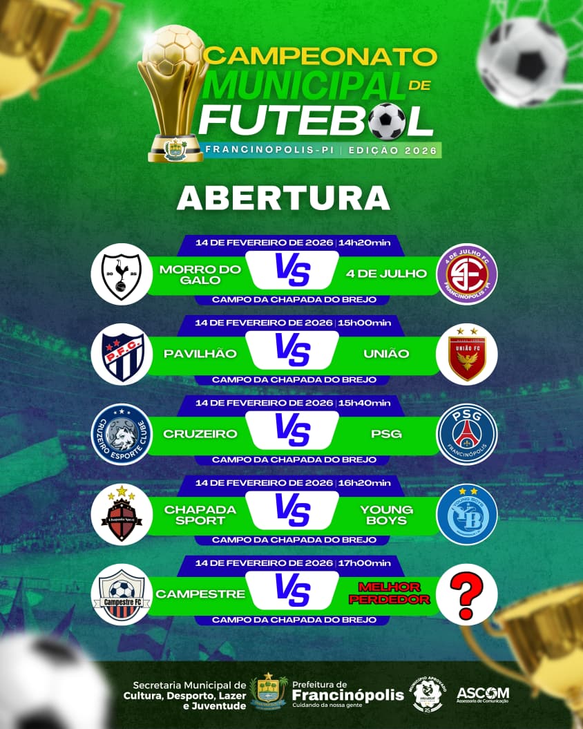 A Prefeitura de Francinópolis, por meio da Secretaria Municipal de Cultura, Desporto, Lazer e Juventude, realiza neste sábado, 14 de fevereiro, a Abertura do Campeonato Municipal de Futebol - Edição 2026. O evento acontecerá no Campo de Futebol da Chapada do Brejo, a partir das 14h20, e promete movimentar atletas, torcedores e amantes do esporte no município.