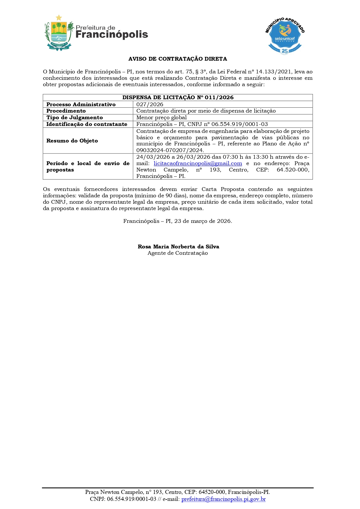 O Município de Francinópolis – PI, nos termos do art. 75, § 3º, da Lei Federal nº 14.133/2021, leva ao conhecimento dos interessados que está realizando Contratação Direta e manifesta o interesse em obter propostas adicionais de eventuais interessados, conforme informado a seguir: