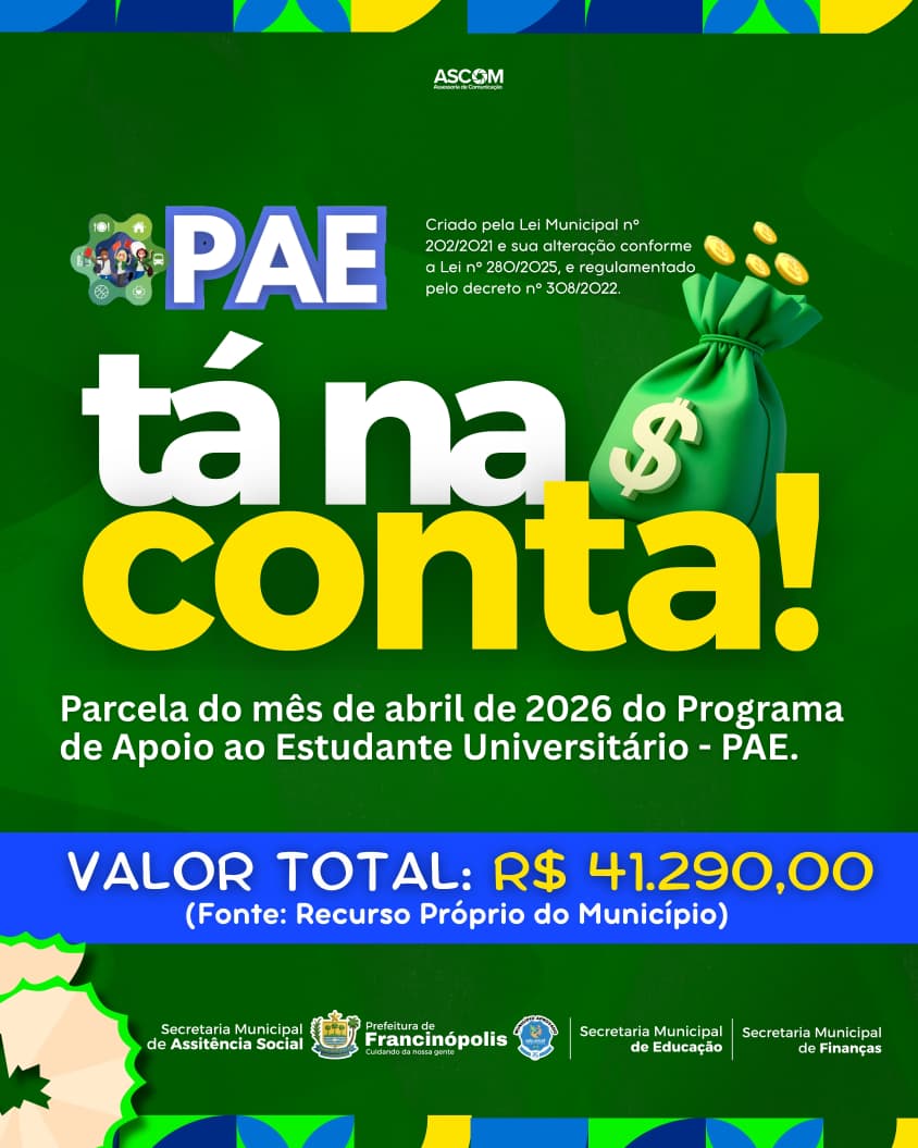 A Prefeitura de Francinópolis efetuou o pagamento da parcela do mês de abril de 2026 do Programa de Apoio ao Estudante Universitário (PAE), reafirmando o compromisso da gestão municipal com a educação e o incentivo à formação acadêmica dos jovens do município.