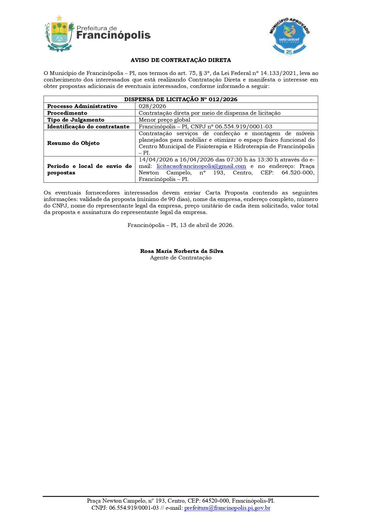 O Município de Francinópolis – PI, nos termos do art. 75, § 3º, da Lei Federal nº 14.133/2021, leva ao conhecimento dos interessados que está realizando Contratação Direta e manifesta o interesse em obter propostas adicionais de eventuais interessados, conforme informado a seguir: