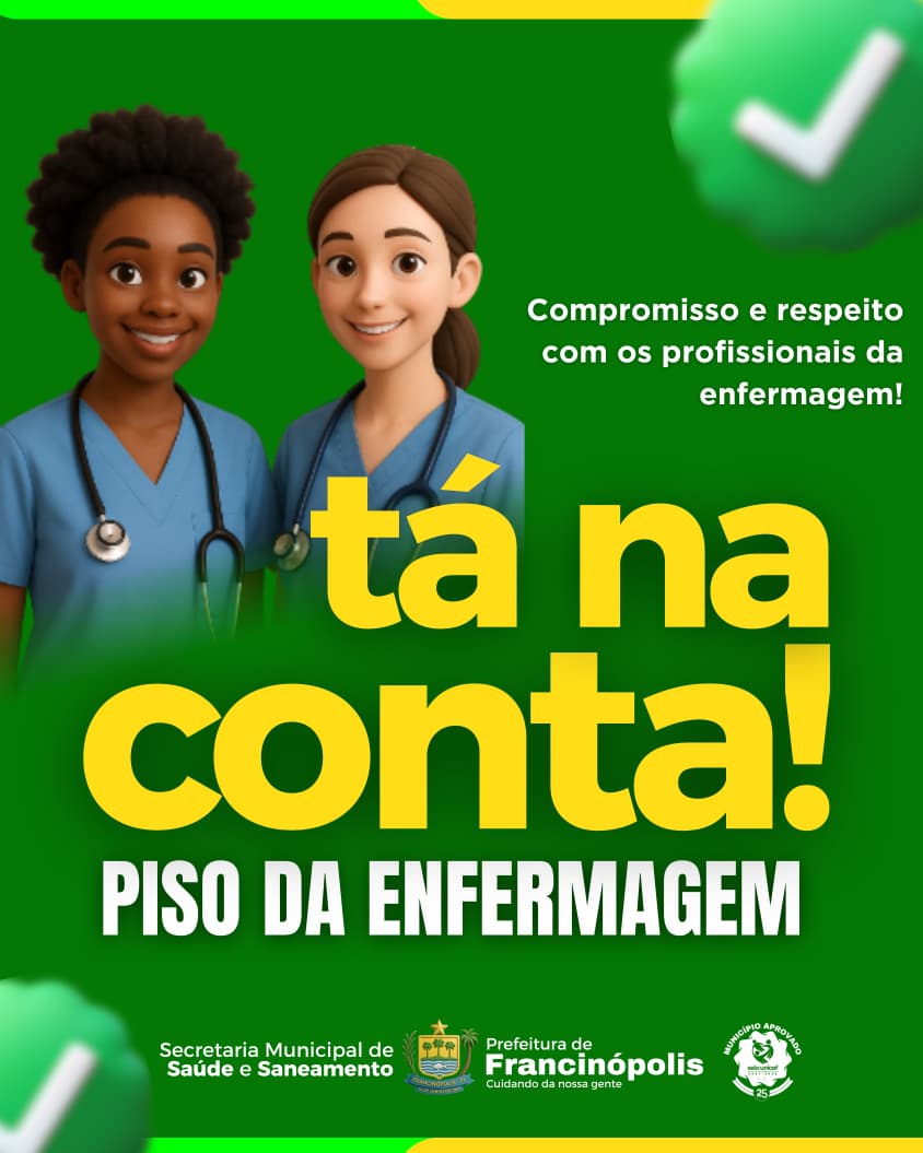 A Prefeitura de Francinópolis, por meio da Secretaria Municipal de Saúde e Saneamento, efetuou nesta sexta-feira, 03 de outubro, o pagamento do Piso da Enfermagem aos profissionais da área.