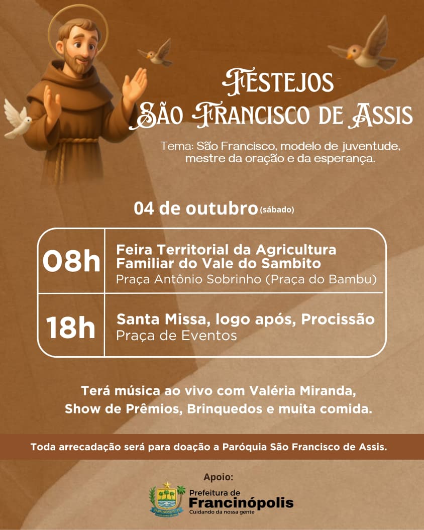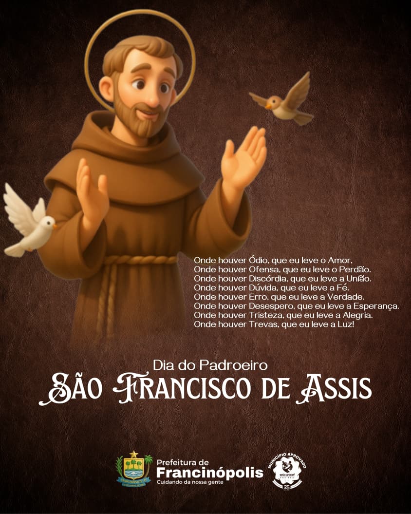Neste sábado, 4 de outubro, Francinópolis celebra com fé e devoção o dia do seu padroeiro, São Francisco de Assis, uma figura que inspira valores de simplicidade, paz e amor ao próximo.