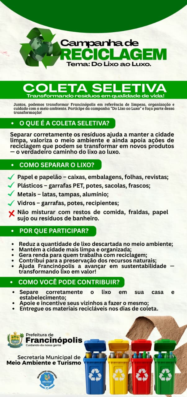 A Prefeitura de Francinópolis, por meio da Secretaria Municipal de Meio Ambiente e Turismo, promoverá a coleta de papelão nos mercados/supermercados da cidade entre os dias 26 e 28 de novembro de 2025. A ação integra a Campanha de Reciclagem, que este ano traz o tema “Do Lixo ao Luxo”, reforçando a importância da gestão adequada dos resíduos e do compromisso com práticas ambientais responsáveis.