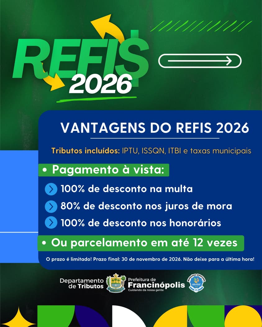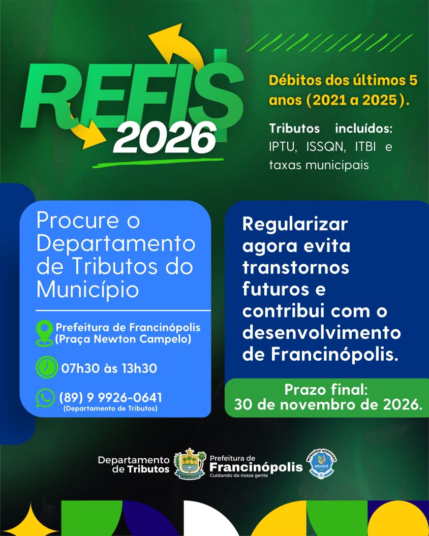 A Prefeitura Municipal de Francinópolis reforça aos contribuintes que o Programa de Benefício Fiscal – REFIS 2026, instituído pela Lei nº 281/2025, segue vigente com prazo final de adesão até 30 de novembro de 2026.